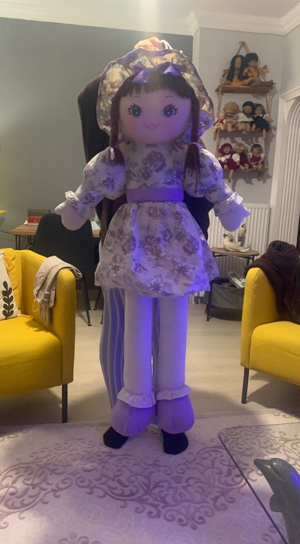 Lila tonlarında, çiçek desenli elbise ve şapka ile yumuşak kumaştan yapılmış, sevimli detaylara sahip pastel bebek. 125 cm