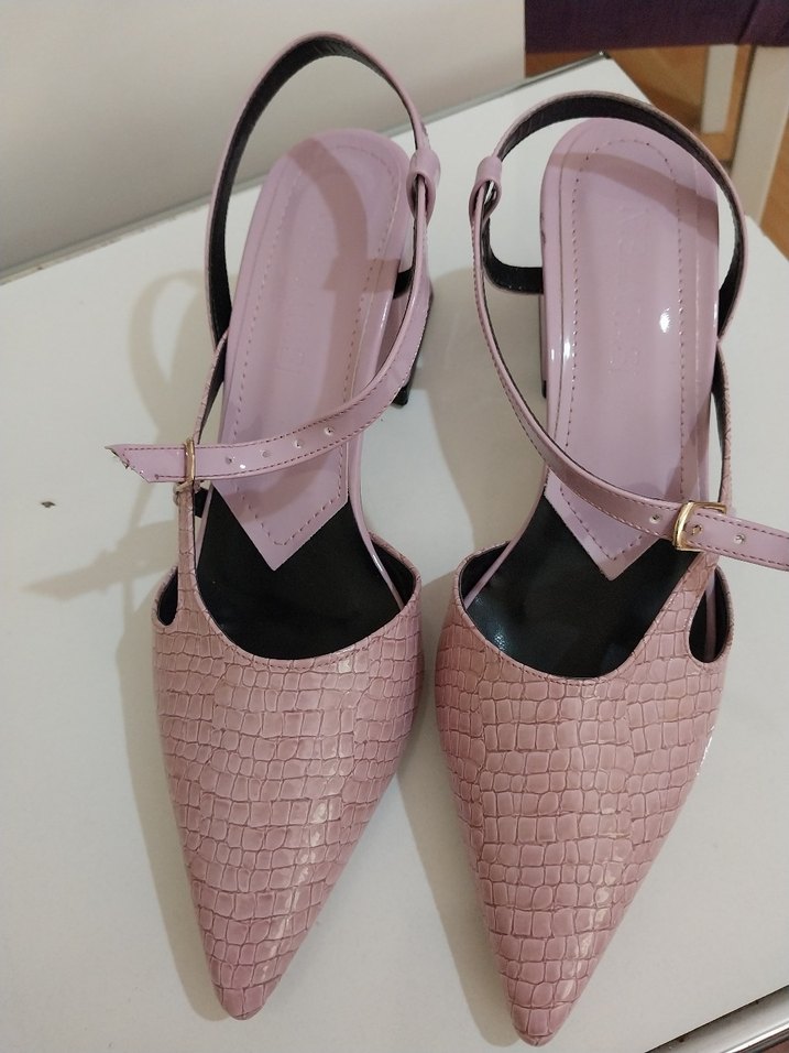 Nişantaşı marka Pastel pembe yılan deseni ve tokalı kayışa sahip stiletto topuklu ayakkabı. neredeyse hiç giyilmedi altından da anlarsınız zaten çok güzel ama bana büyük geldiği için satıyorum