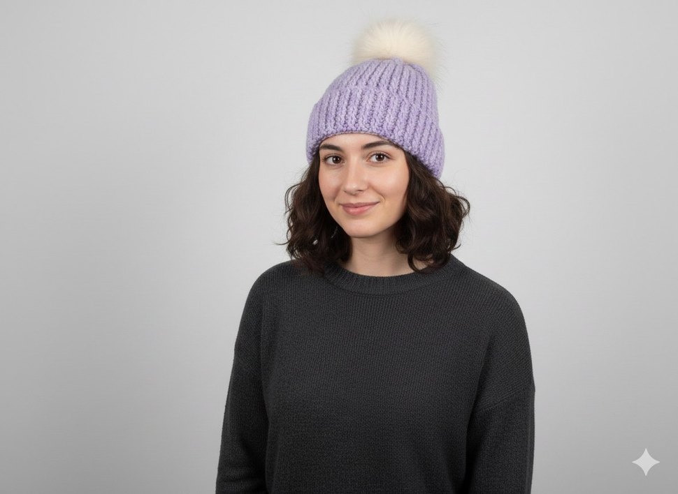 Lila renkli, beyaz ponponlu triko kadın bere, yumuşak dokusu ve sade tasarımıyla rahat ve temel bir görünüm sunar.