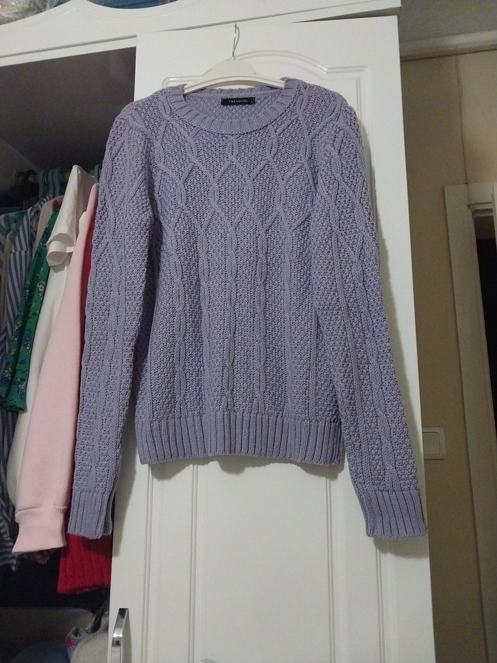 1 kez kullanıldı lila renkte, uzun kollu, yuvarlak yaka ve bol kesim triko kazak. Normal midi boyda, rahat ve desensiz tasarıma sahip.