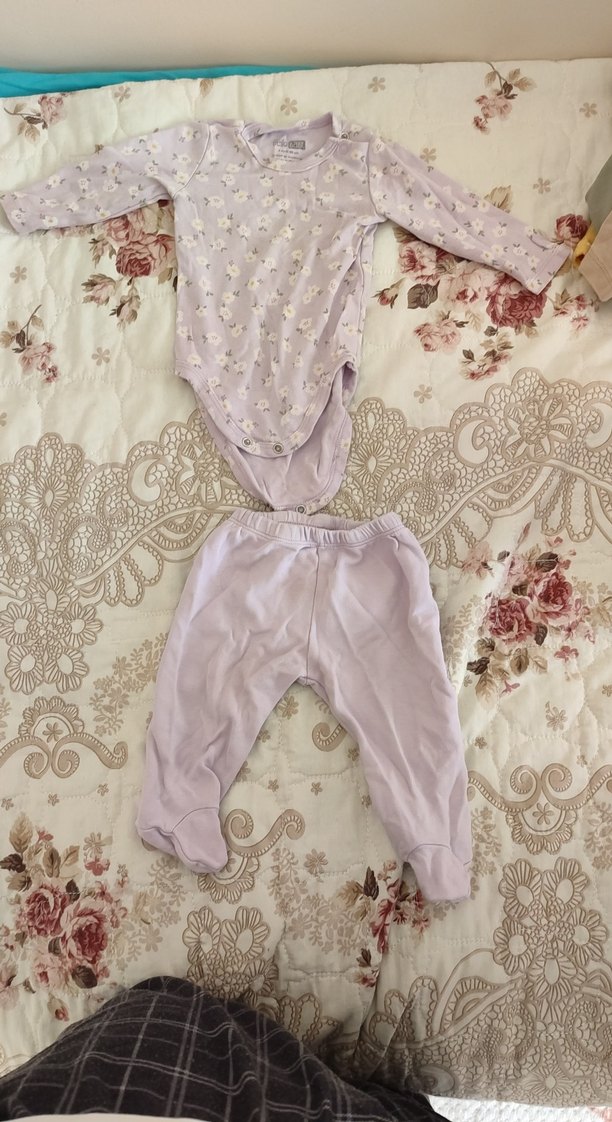 Lila tonlarda, uzun kollu bebek body ve uyumlu yumuşak pantolon takımı.üstü çiçekli ve altında arka tarafında ayıcık deseni vardır