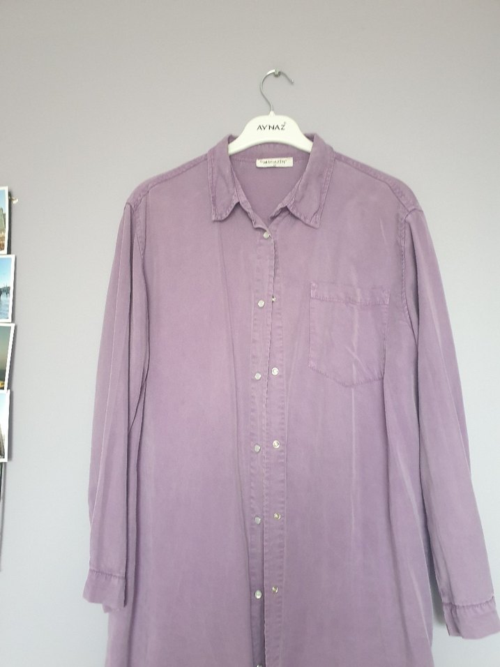 Yumuşak keten kumaştan, uzun kollu, düğmeli ve yakalı, günlük kullanım için uygun lila renk gömlek.