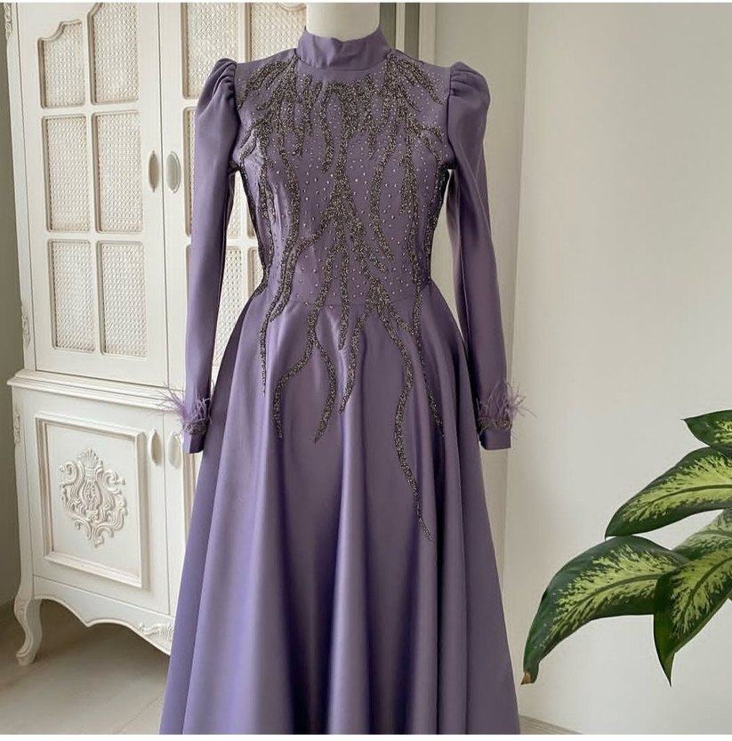 lila Uzun Kollu İşlemeli Abiye Elbise