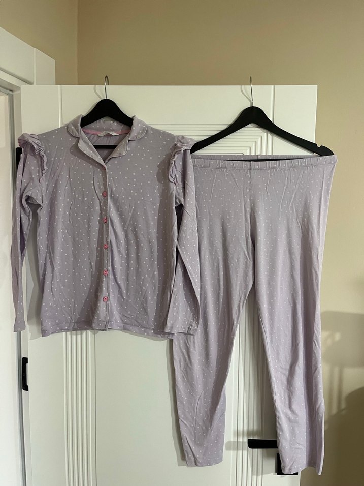 Lila renkli, uzun kollu, bol kesim kız çocuk pijama takımı. Üst kısmı düğmeli ve ince benekli desene sahip. 11-12 yaş ve 146-152 cm.