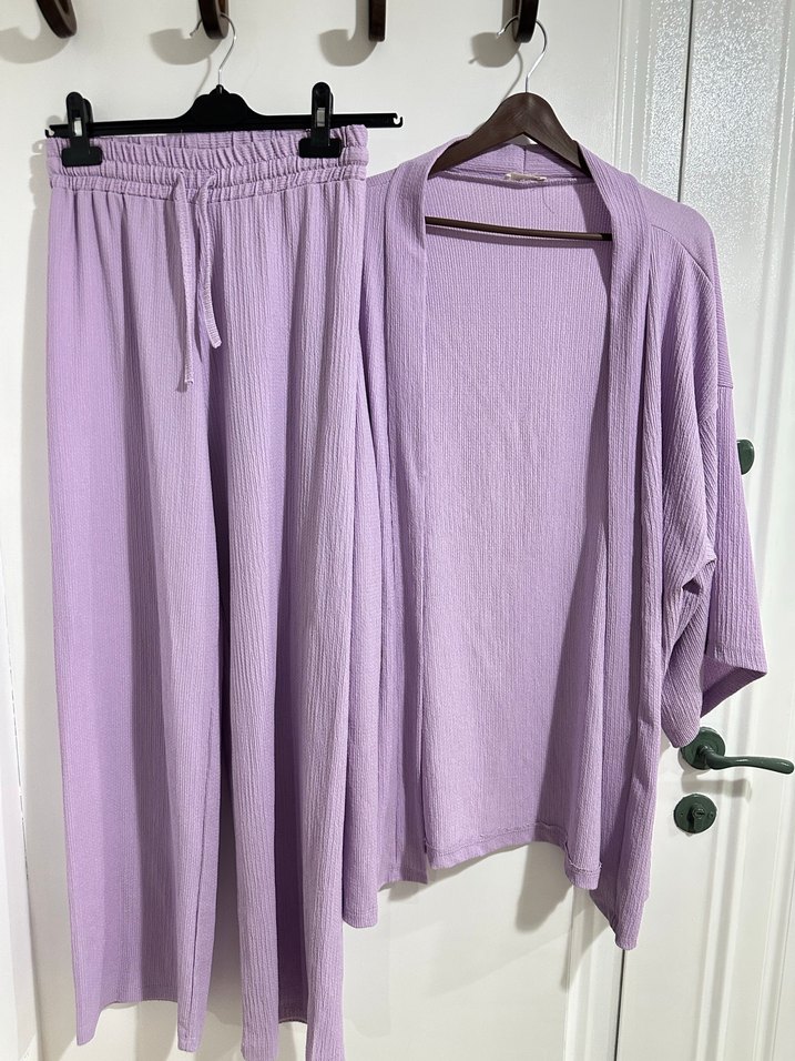 Lila, uzun kollu, bol kesim keten kumaştan, pileli dokulu ve yuvarlak yakalı, günlük rahat kullanım için uygun kimono.