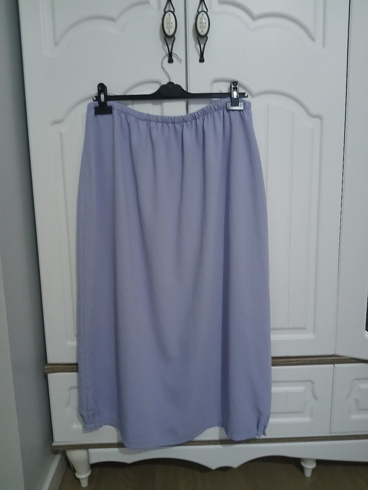 Mor renkte, sentetik kumaştan yapılmış uzun, salaş ve drapeli etek, minimalist günlük kullanım için uygundur.