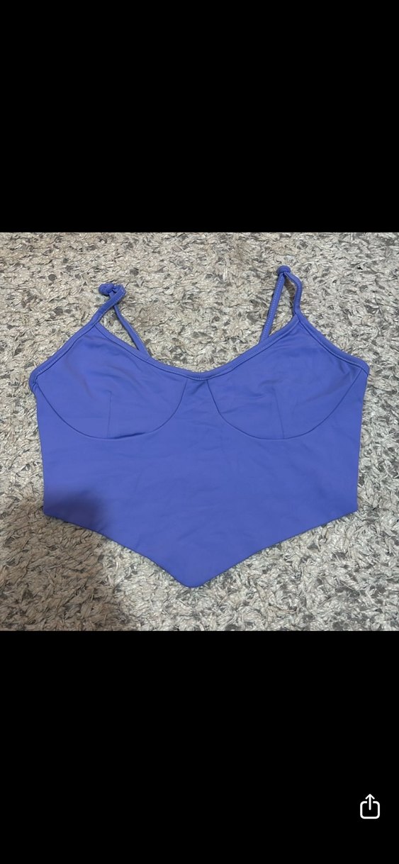 Lila, V yakalı, kolsuz ve vücuda oturan kesime sahip, yumuşak sentetik kumaştan yapılmış bustiyer. Cesur sokak stili için uygun.