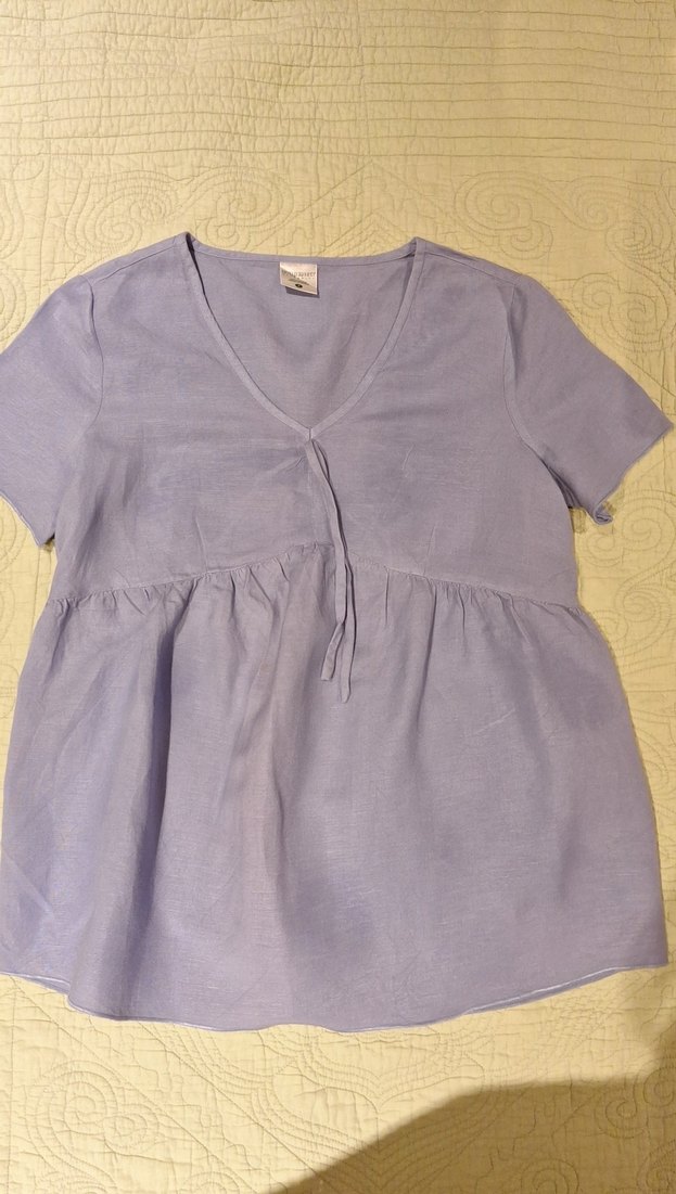 Lila pastel renkte, keten kumaştan, kısa kollu, V yakalı, bol kesim hamile bluzu, günlük kullanım için rahat. S-beden