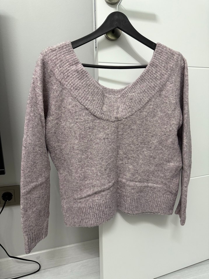 Lila renkli, V yakalı ve uzun kollu kadın örgü kazak. Rahat kesimi ve normal boyu ile günlük kullanıma uygun, konforlu bir modeldir.