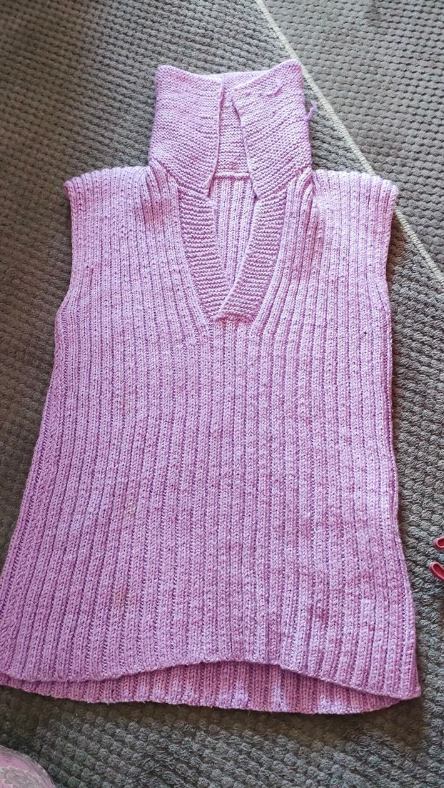 Pastel pembe renkli, V yakalı, triko örme, kolsuz süveter. Rahat ve bol kesimiyle günlük kullanıma uygundur.