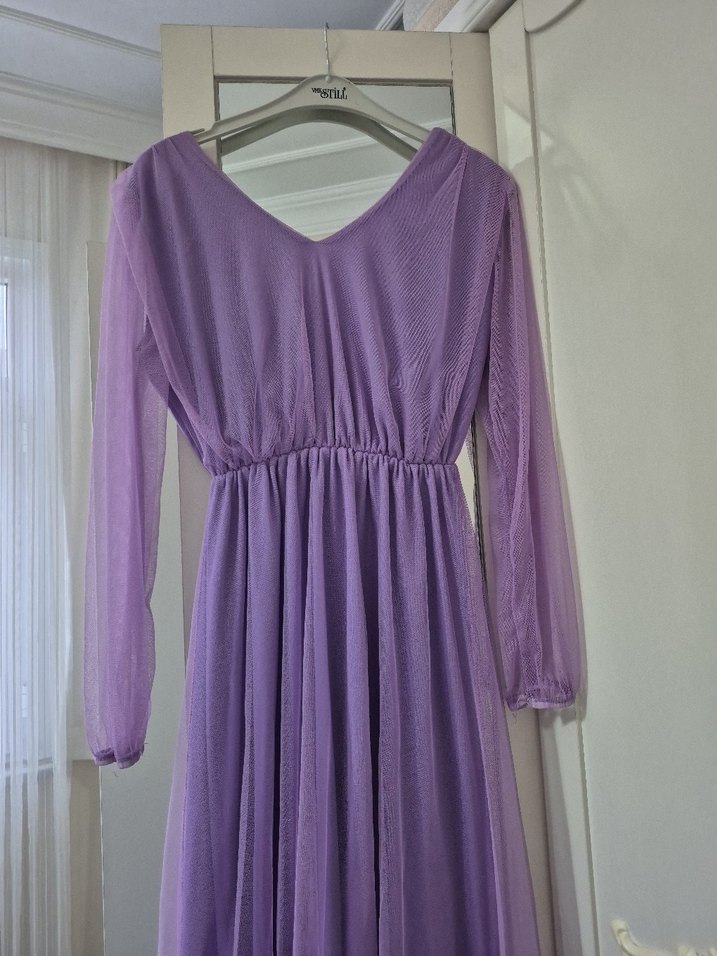 Lila renkte, V yakalı ve drapeli uzun kollu elbise. Gevşek kesimi ve yumuşak sentetik kumaşıyla vintage bohem tarzını yansıtır, düğünler için uygundur.