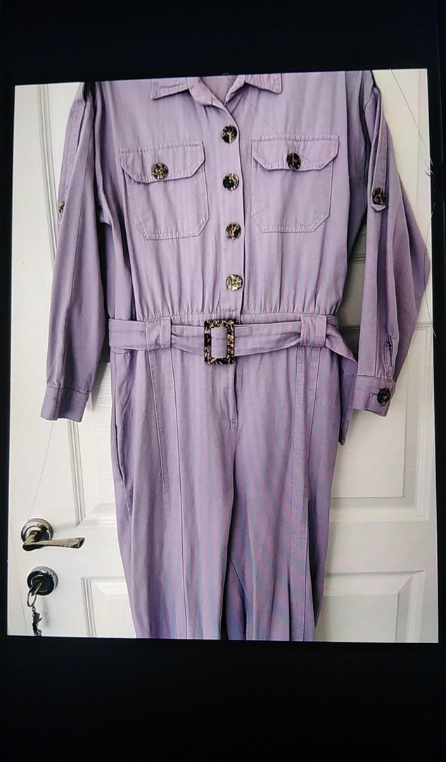 Pastel lila renkte, düğmeli ve kemerli, keten kumaştan vintage tarzda uzun kadın tulumu. Bohem ve retro stil için uygundur.