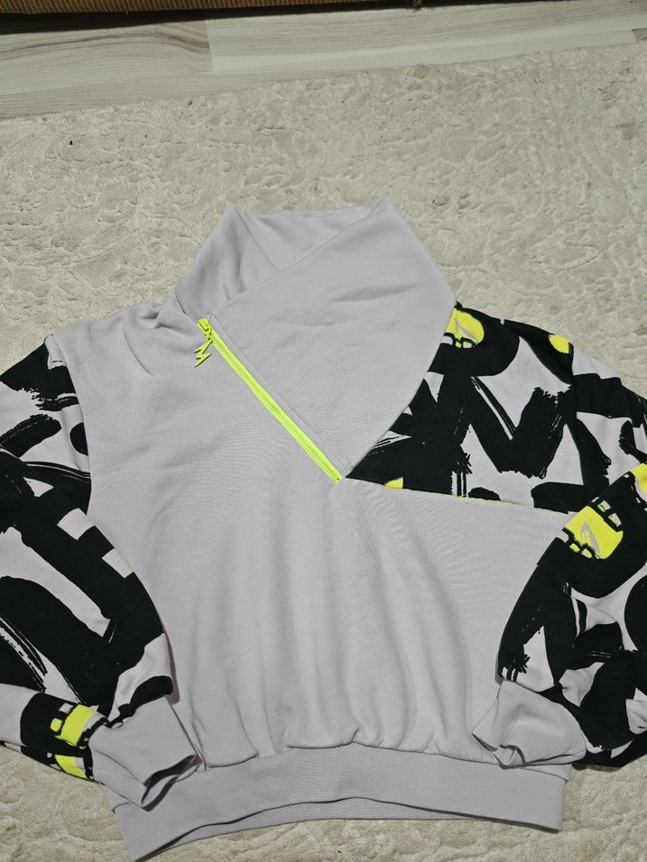 Yüksek yakalı, neon sarı yarım fermuarlı ve uzun kollu, siyah-sarı baskılı desenlere sahip lila kadın sweatshirtü. Rahat kesim ve kısa boy, yumuşak ve sıcak kumaştan üretilmiştir.