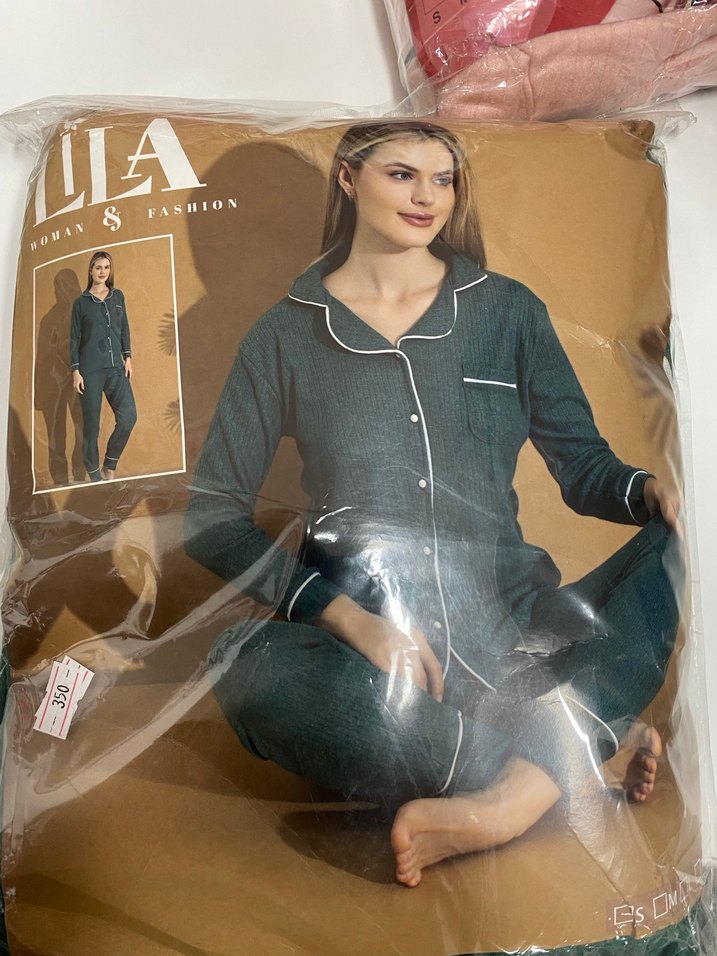 Lila marka yeşil uzun kollu, bol kesim kadın pijama takımı, uzun boyu ve sade deseniyle rahatlık sağlar.