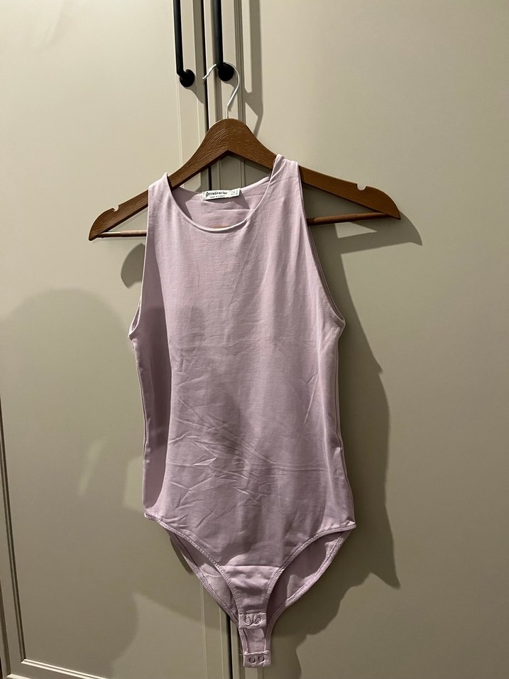 Lila pastel renkte, yüksek yakalı ve kolsuz, vücuda oturan bir body. Normal midi boyda ve desensizdir.