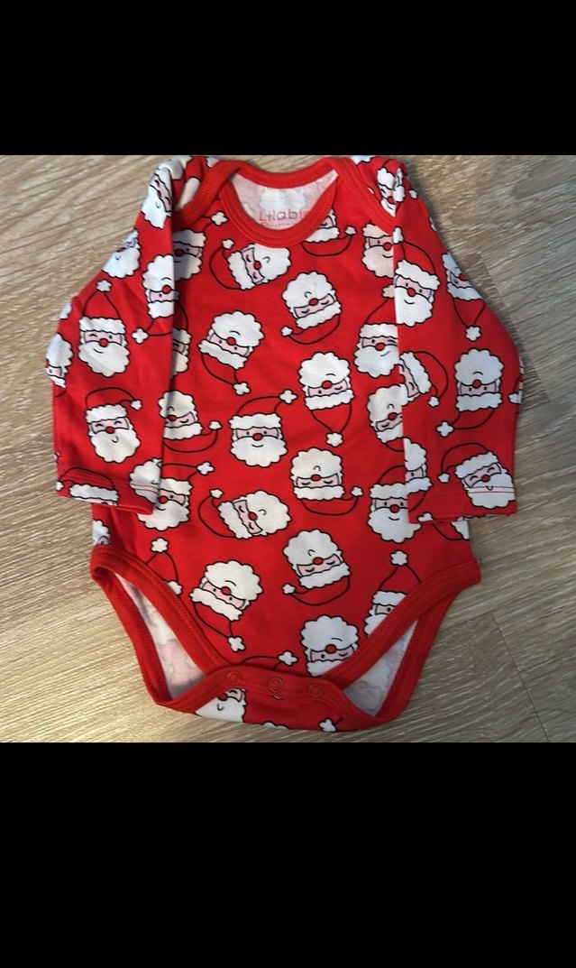 Renkli kırmızı body, uzun kollu ve yuvarlak yaka olup, neşeli Noel baba baskılarıyla süslenmiştir. Yumuşak ve organik kumaştan üretilmiştir.