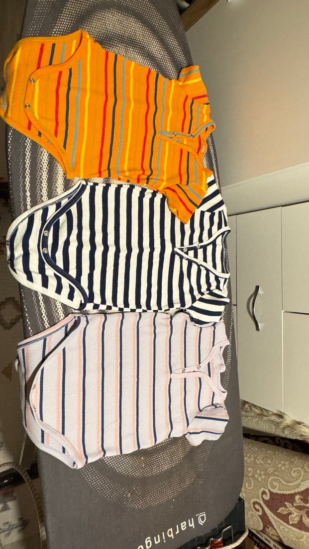 Çizgili desenli, V yaka ve kısa kollu, pileli detaylara sahip açık renkli bebek kız body'leri. Üç ürün birlikte satılmaktadır turuncu olan 1 yaş diğerleri 2 yaş bedendir. Gayet kullanışlı bodyler turuncu olanın kumaşı daha yumuşak ve esnektir