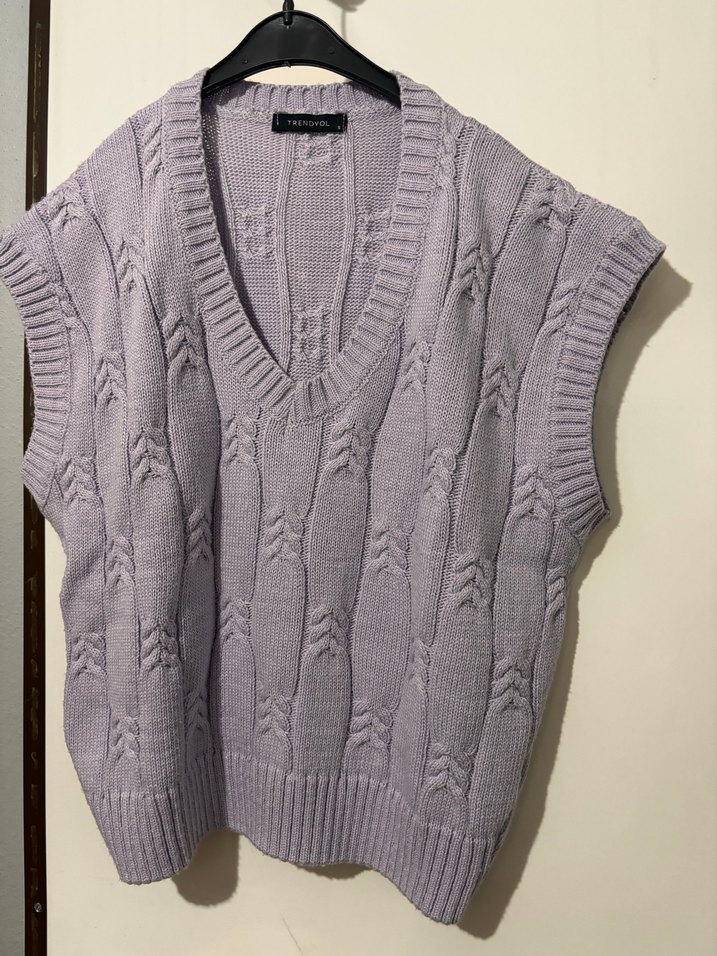 Lila renkli, V yakalı ve kolsuz örgü kadın süveter, rahat ve salaş kesimiyle günlük kullanıma uygundur.