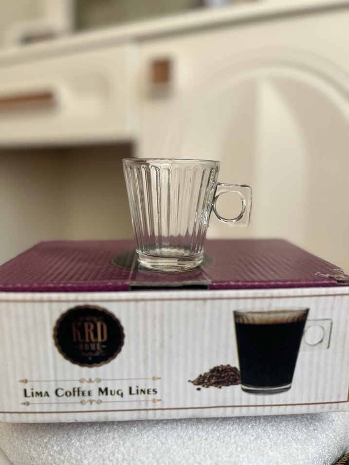 Dikey çizgili ve yuvarlak saplı şeffaf cam kahve bardağı, kutusuyla birlikte sunulmuştur. Kutuda kahve çekirdeği deseni ve koyu bej renk bulunmaktadır. ☕6 tane mevcuttur