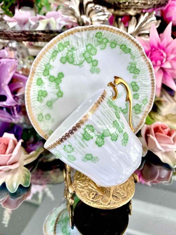1894-1900 yıllar arası Fransa’da üretilen, Limoges D & Co (Delinières & Co. )ve G. KIEFER & Cie BALE (İsviçre Basel merkezli distribütör firması) çift damgalı, kaliteli yumurta kabuğu inceliğinde parlak sırlı porselene sahip, estetik yoğun gofreli form yapısı ve kulp detayları, pastel yeşil tonlarda dekore edilmiş floral desenler, altın işlemelerle süslenmiş, el boyama çok zarif koleksiyonluk bir antika fincan seti. Türk kahve boyudur. Ölçüleri: Fincan ağız çapı : Ø 6,5 cm., boy 6,1 cm., tabak çapı: Ø 12,1 cm. Ürün kodu:0691 İADE ve DEĞİŞİM YOKTUR #limoges #dclimoges #Delinieres #GKIEFER #fincan #kahve #kahvefincanı #antika #koleksiyon #özel #zarif #dekor #vitrin #hediyelik #vintage #kahveseti