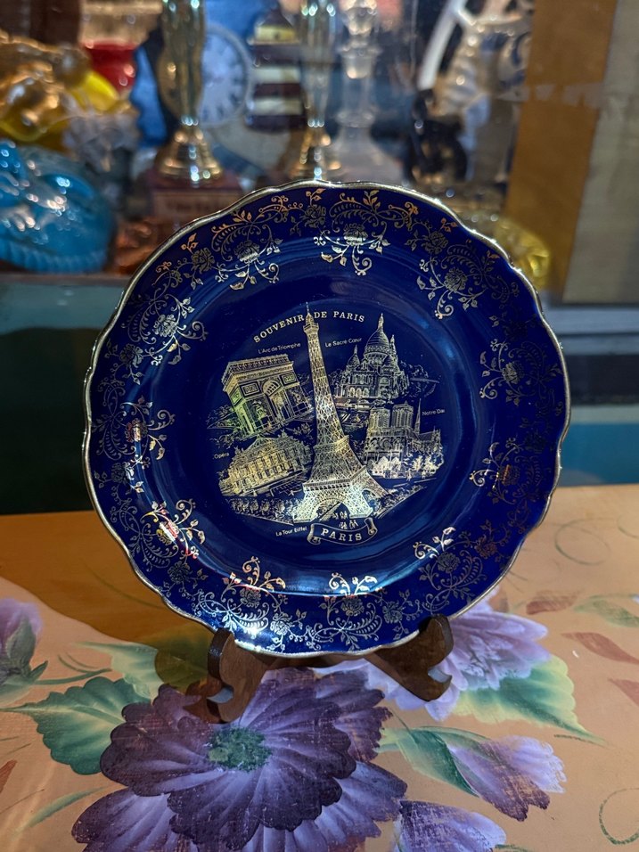 Parlak mavi yüzeyli, altın detaylı ve Paris'in simge yapıtlarını içeren dekoratif tabak. ️