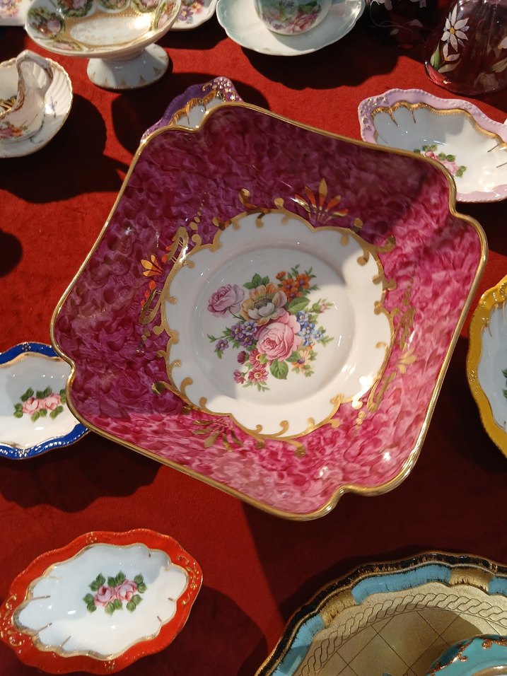 Pembe desenli kenarı ve çiçek desenli ortası olan kare seramik tabak, klasik görünüm için altın detaylarla süslenmiştir. ️Hatasız kusursuz istenirse ayrı ayrıca satılır.Sunumluk LİMOGES FRANCE DAMGALI, çerezlikler ipek porselen damgalıdır.Limoges sunumluk 6000TL çerezlikler adet 1000TL olur.