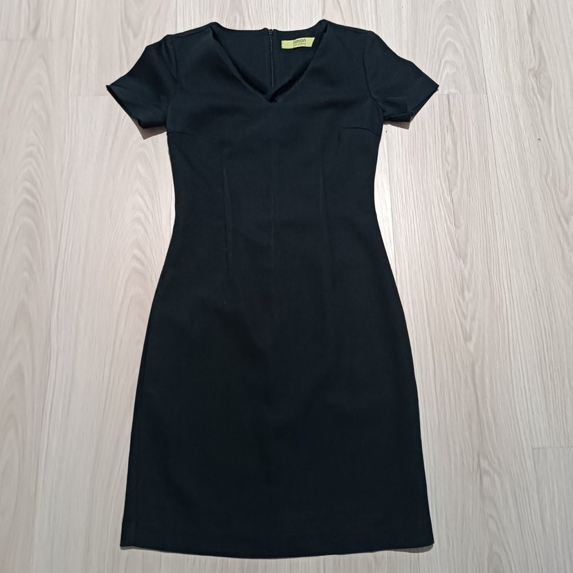 V yakalı, kısa kollu siyah midi elbise, ofis için uygun sade ve rahat kesimli goth tarzında şık bir parça. 34 beden, sadece fermuar ucunun renginde açılma var.