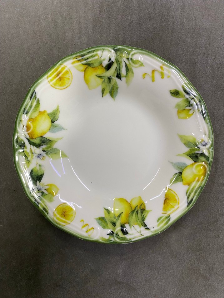 Limon motifleri ve yeşil yapraklarla süslenmiş, dalgalı kenarlı yuvarlak porselen tabak.