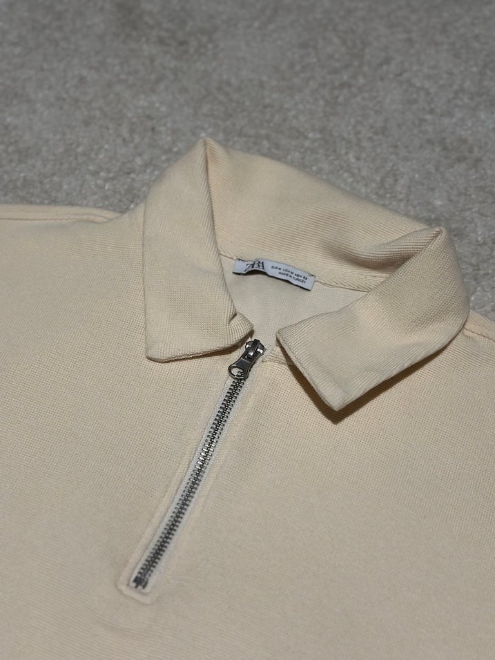 Limon sarısı renkte fermuarlı, sokak stili tasarıma sahip hafif crop erkek tişört. Düz ve yumuşak kumaştan üretilmiştir.