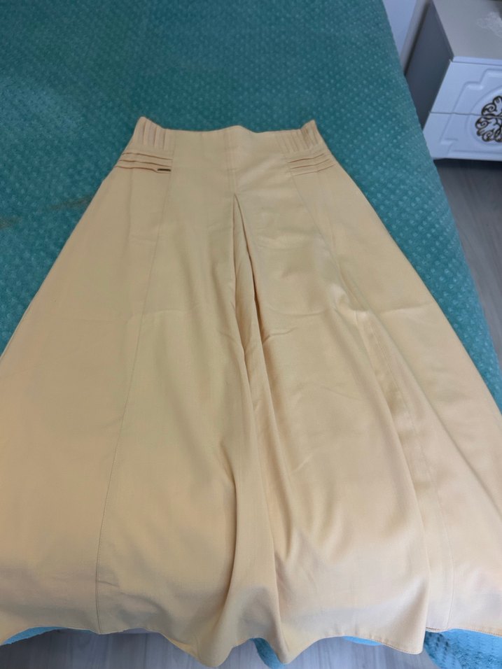 Sarı renkte, piliseli detaylara sahip, pamuk kumaştan üretilmiş, düz kesim uzun etek. Minimalist günlük stil için uygundur.