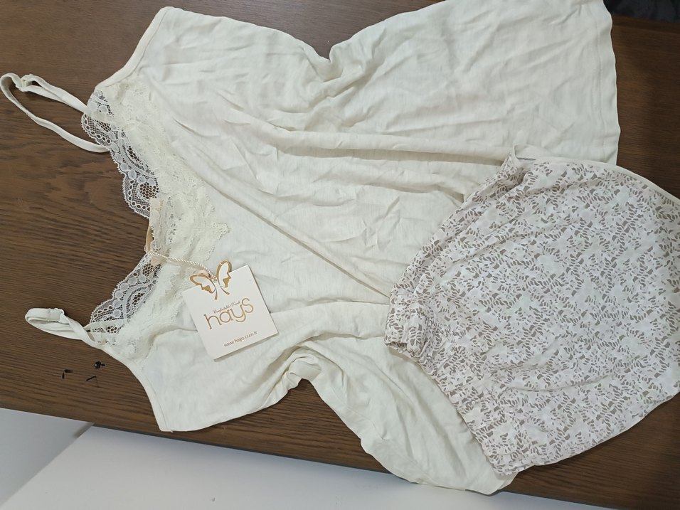 Hays markalı, beyaz renkli, V yaka, kısa kollu, baskılı desenli, bol kesim mini hamile ve emzirme geceliği. Rahat gece kullanımı için.