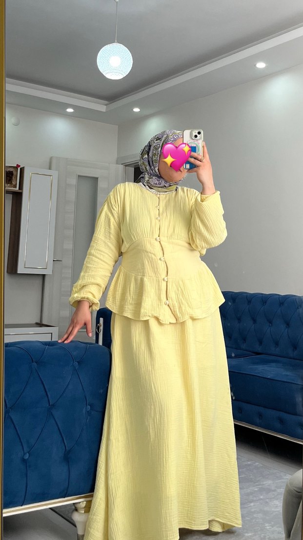 Limon sarısı Müslin kumaş etekli takım 70 kilo 160 boyda kullandım etek yarım astarlı üst astarsız Marka temsili