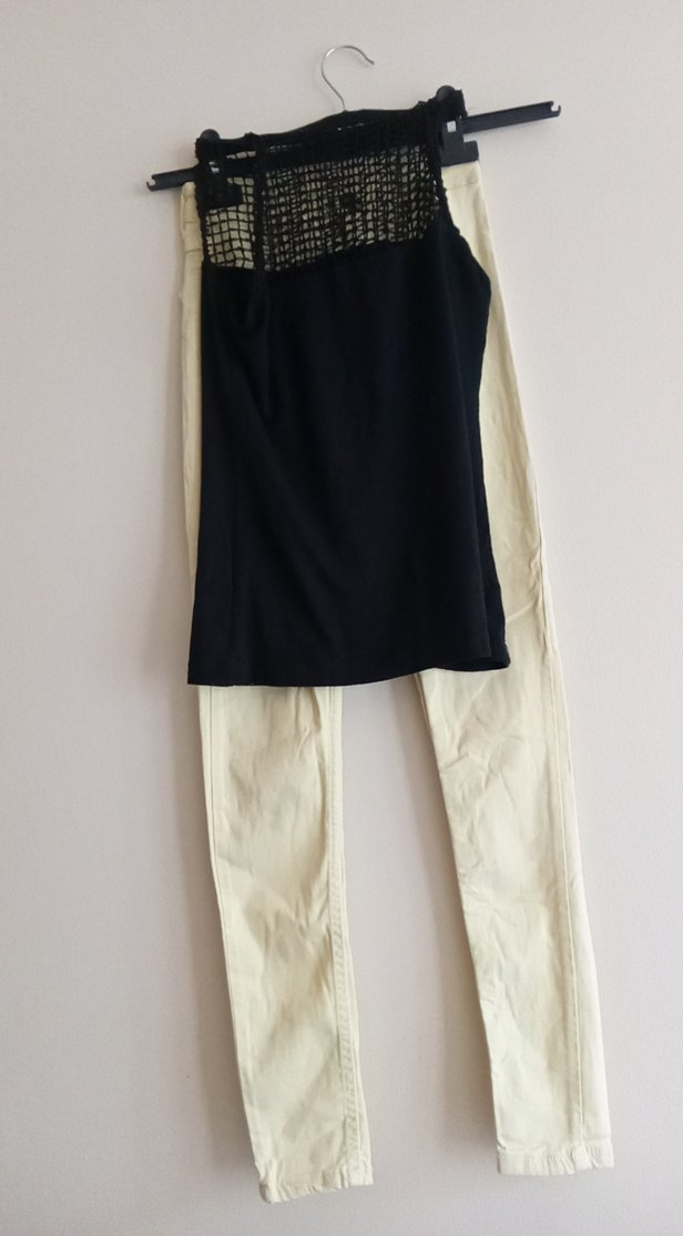 Pamuklu,pantolonu ile dokulu detaylı siyah straplez üst, günlük rahat kullanım için uygundur. üst en 40 boy 50 pantolon bel 30 boy 70 az likralı