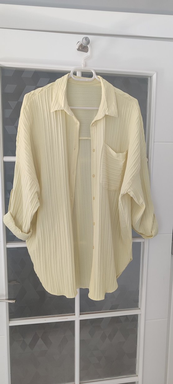 keten kumaştan pilili, bol kesim kadın gömlek. Uzun kollu ve yakalı, günlük rahat kullanım için uygun. standart bedendir. lımon sarısı rengindedir. yıkamak için etiketini çıkardım hiç kullanmadım.