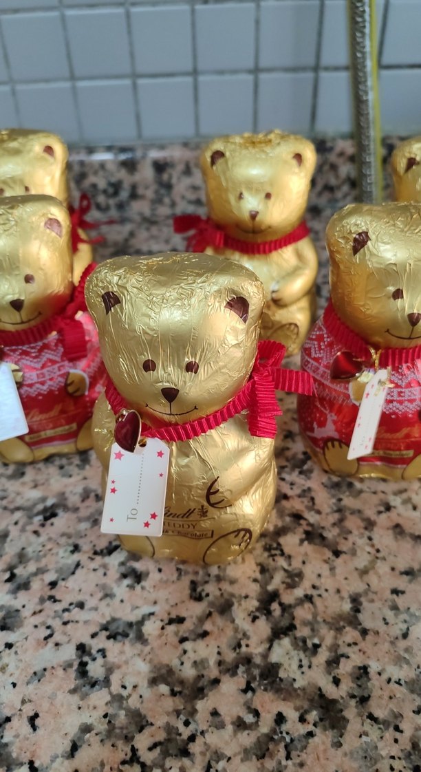 Adet fiyatıdır.Yeni yıl için tasarlanmış. İthal üründür. Altın renkli folyo ile kaplanmış peluş ayıcık, kırmızı kurdele ve hediye etiketi ile süslenmiştir. Renkli ve sevimli bir hediye seçeneği. 100 gr. 6 adet mevcuttur. #lindt #ayicik #cikolata