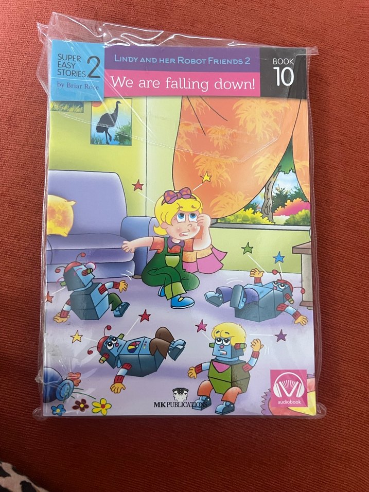 Pastel renkli kapağa sahip "Lindy ve Robot Arkadaşları 2" adlı çocuk kitabı, "We are falling down!" hikayesini içerir. Super Easy Stories serisinin 10. kitabıdır.