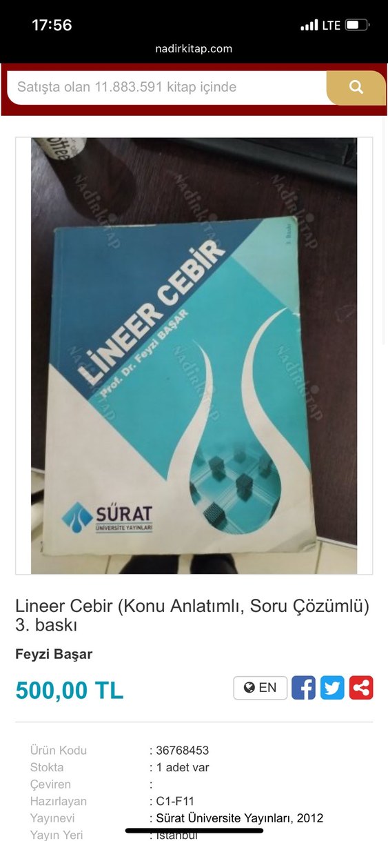 Feyzi Başar'ın yazdığı, konu anlatımlı ve soru çözümlü lineer cebir kitabının 3. baskısı. SURAT Üniversite Yayınları tarafından yayımlandı.