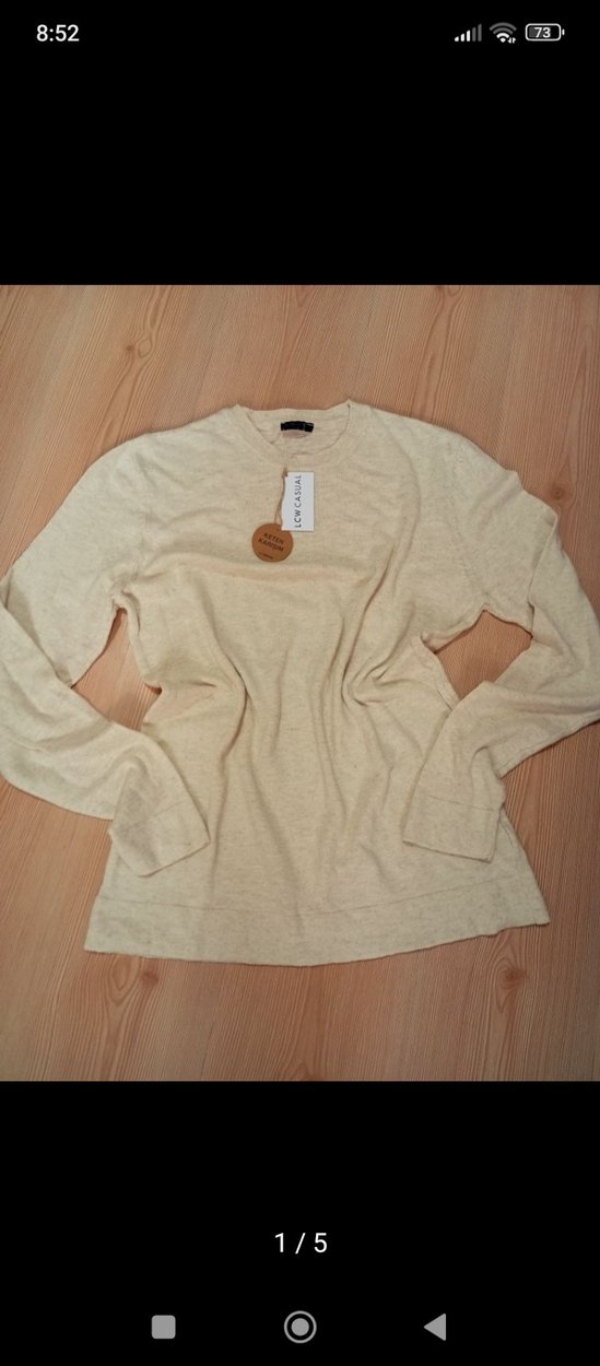 krem renkli erkek kadın keten kazak, uzun kollu ve yuvarlak yakalıdır. Bol kesimi ve normal uzunluğu ile sade ve rahat bir stil sunar. incecik