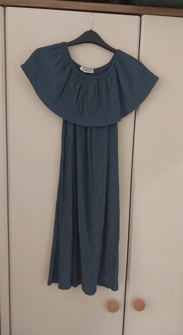 Linen kumaştan, tek renkli lacivert bohem tarzda, uzun ve bol kesim elbise. Kayık yaka ve kolsuz, pileli detaylara sahip.