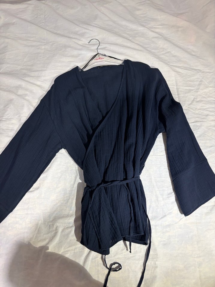 Uzun kollu, V yakalı, bol kesim lacivert keten midi kimono. Dökümlü tasarımı ve minimal sade tarzıyla günlük kullanım için uygun.