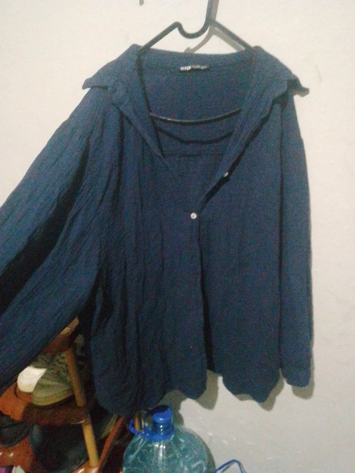 Linen kumaştan üretilmiş, bol kesim ve düğmeli, notalı yakalı uzun kollu mavi gömlek. Günlük rahat sokak stili için uygundur.