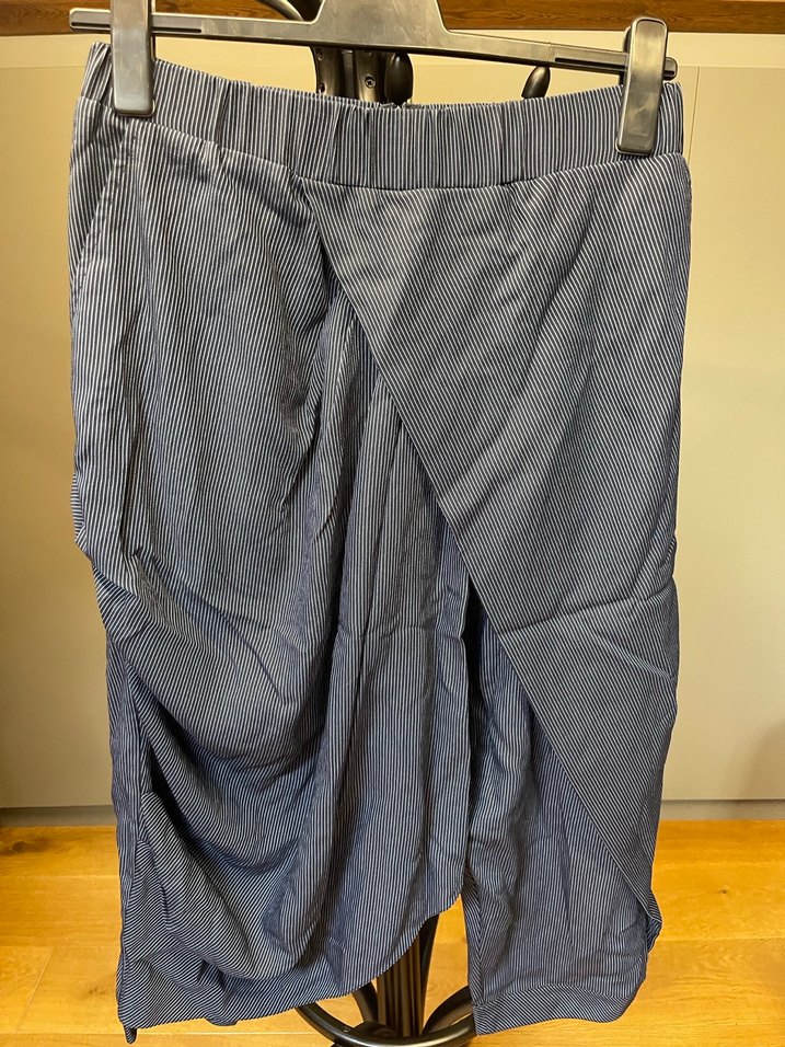Normal uzunlukta pilili, bol kesim hamile eteği. Keten kumaştan, mavi tonunda ve ofis kullanımı için uygun.