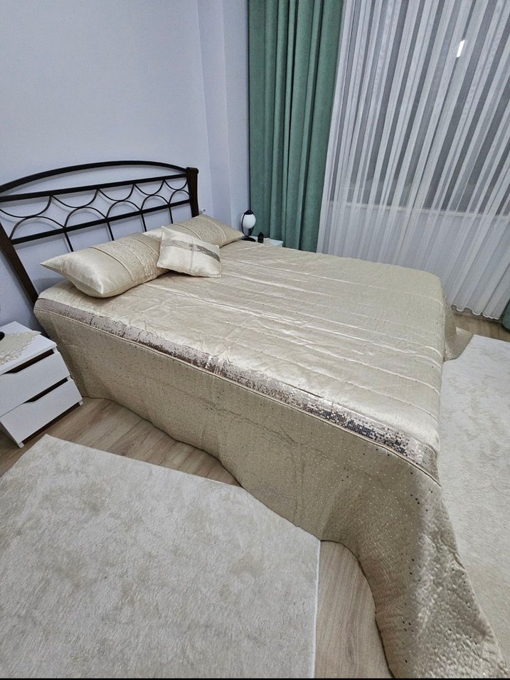 Parlak yüzeyli ve işlemeli detaylara sahip bej yatak örtüsü, yatak odasına zarif bir dokunuş katıyor ️.boy 260 cm en 160 cm + kenarları 56 cm