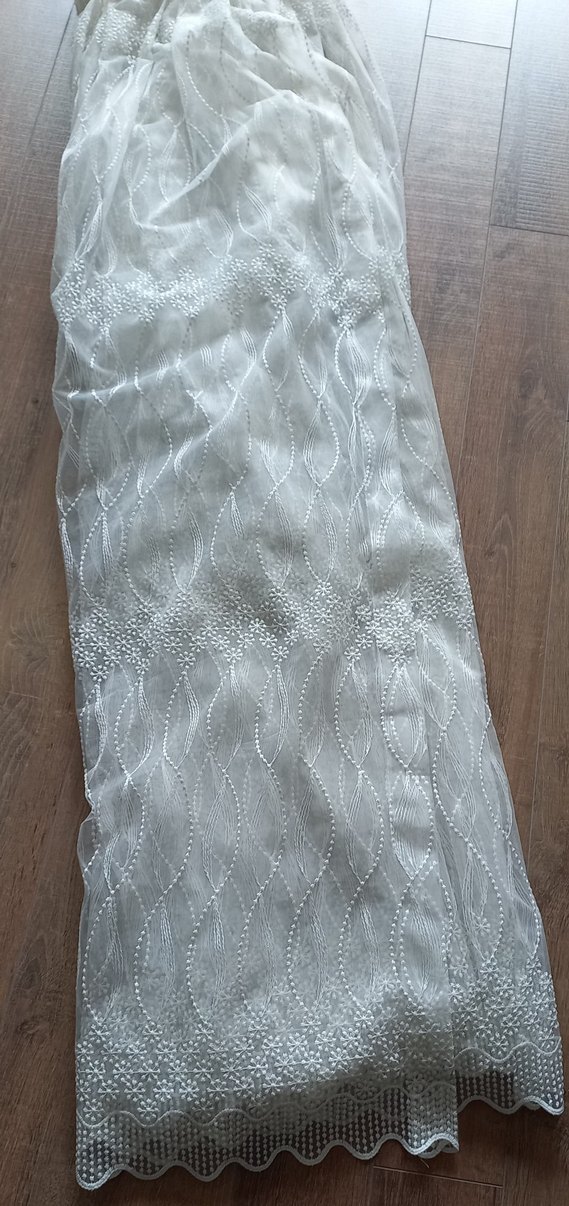 Nakışlı desenlere sahip beyaz, hafif ve şeffaf kumaştan yapılmış klasik perde. Doğal ışık geçişine izin verir. 1 ay kullanildi. çok uygun verecegim