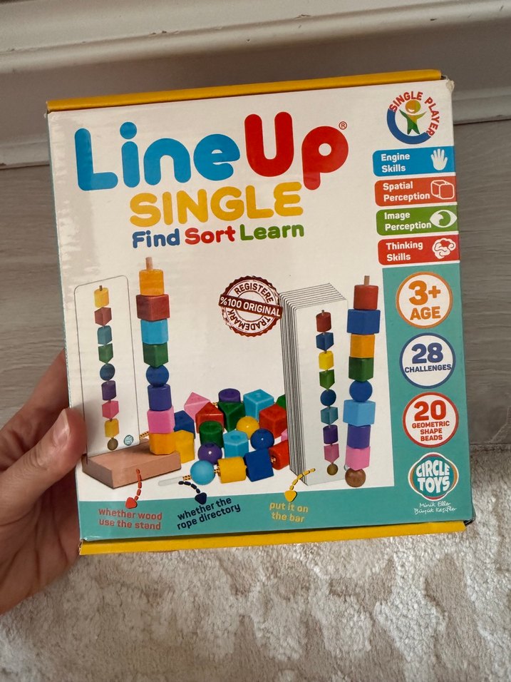 LineUp Single, 3 yaş ve üzeri çocuklar için motor beceriler, mekansal algı, görsel algı ve düşünme becerilerini geliştiren 28 zorluk ve 20 geometrik boncuk içerir.