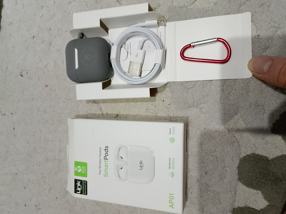 Link AP01 beyaz kablosuz kulaklık, şarj kutusu ve USB kablo ile birlikte. Akıllı dokunmatik kontrol ve fitness özellikleri bulunur. sıfır kutusunda hiç kullanılmadı
