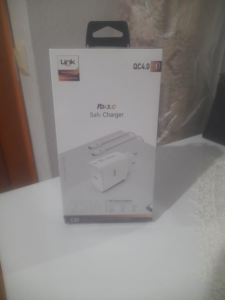 Link markalı beyaz şarj adaptörü, QC4.0 hızlı şarj ve Safe Charger teknolojisi ile güvenli ve hızlı güç sağlar.