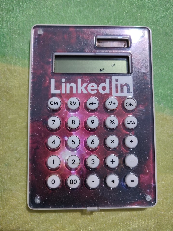 Koyu pembe renkte, ön yüzünde LinkedIn logosu bulunan, güneş enerjili düğmeli hesap makinesi. 2.fotoda görülen ekranda siyah leke vardır bu durumda kabul eden alsın. kolleksiyonluk pili bitince durumu bilinmiyor