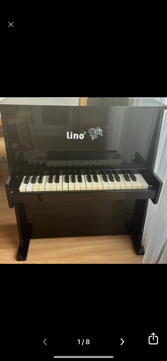 Lino markasının çocuklar için uygun, kompakt tasarıma sahip siyah parlak yüzeyli küçük piyanosu.