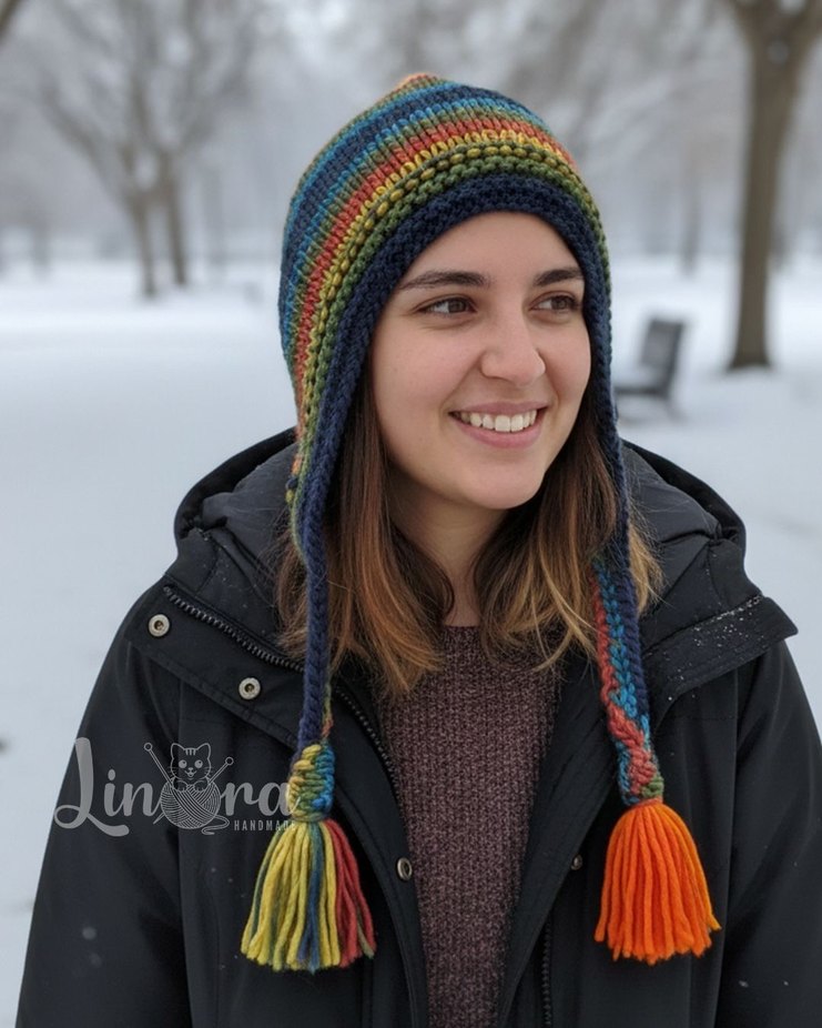 Bohem tarzda çok renkli, örgü kadın bere, püsküllü, sıcak ve rahat bir görünüm sunar.